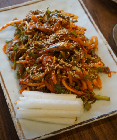 - 6. 마지막으로 참기름 한 방울과 통깨를 넉넉히 뿌려 마무리합니다. 소면을 삶아 곁들이면 더욱 좋습니다.
