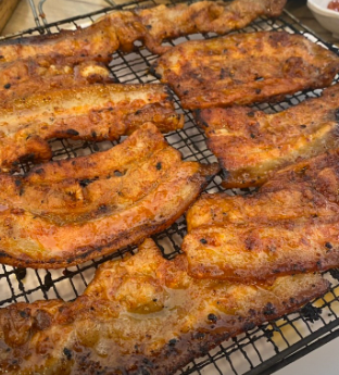 - 팬 구이: 센 불에 팬을 달구어 양념된 고기를 올리고 볶듯이 구워줍니다. 고기가 익으면 토치로 살짝 불맛을 입히거나, 간장 1t를 넣어 간장 탄내로 불맛을 대신합니다.