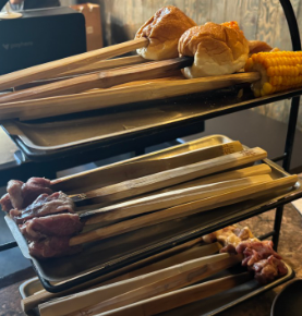 - 꼬치 끼우기: 준비된 고기와 채소를 긴 나무 꼬치에 번갈아 가며 큼직하게 끼워줍니다. 하오카오스탠의 원시 꼬치구이처럼 두툼하게 꽂는 것이 포인트입니다.
