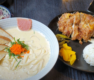 카쿠시타의 대표 메뉴는 방송에 소개된 육즙 가득한 치킨가스입니다. 하지만 이자카야 메뉴인 모츠나베와 명란 크림 우동도 치킨가스와 함께 고객들의 사랑을 받고 있습니다.