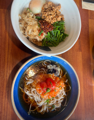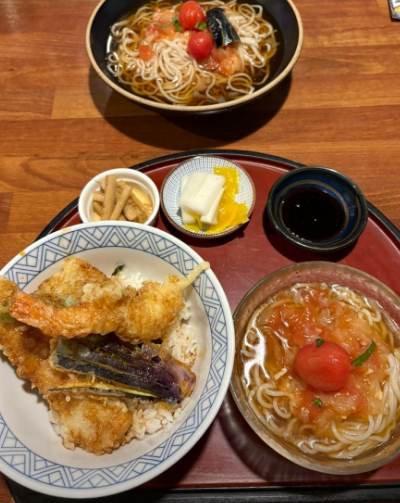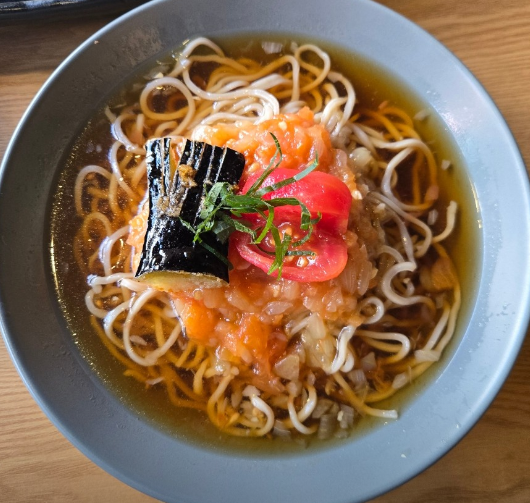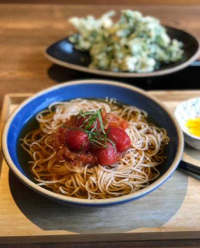 - 재료: 메밀 건면 1인분, 완숙 토마토 1개, 쯔유 육수 250ml, 생강즙 약간, 무순, 연와사비