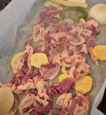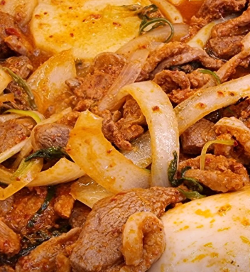 - 조리: 넓은 팬에 양념된 오리고기와 양파를 넣고 센 불에서 볶습니다. 오리에서 기름이 나오므로 별도의 기름은 필요 없습니다.