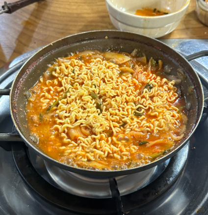 두 번째 매력은 파격적인 무한 리필 서비스입니다. 김치짜글이 7,000원을 주문하면, 테이블마다 마련된 셀프 바에서 신선한 김치, 부추, 육수, 그리고 라면사리까지 원하는 만큼 가져다 먹을 수 있습니다. 이는 사실상 7,000원에 김치짜글이 정식을 무한대로 즐기는 것과 다름없어, 고물가 시대의 '가성비 끝판왕'으로 불리고 있습니다. 끓일수록 진해지는 국물에 라면사리를 넣어 끓여 먹는 마무리는 이 집 김치짜글이를 즐기는 백미입니다. 김치짜글이 7,000원의 행복은 이루 말할 수 없습니다.