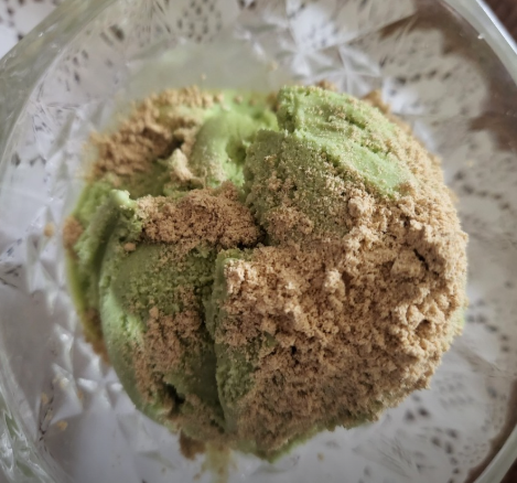 - 따뜻하게 구워진 쑥 와플 위에 콩가루를 듬뿍 뿌려줍니다.