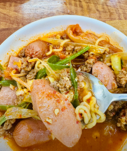 - 밥 위에 국물을 듬뿍 적신 햄과 김치를 올려 비벼 먹는 것이 의정부부대찌개의 별미입니다.