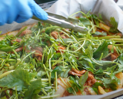 - 재료 준비: 오리정육(슬라이스) 300g, 삼겹살(얇게 썬 것) 300g, 양파, 대파, 깻잎 등 채소 준비.
