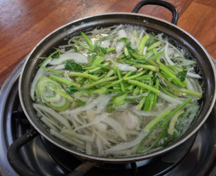 - 손질 복어 (밀복 등) 300g, 무 1/4개, 콩나물 1줌, 미나리 1줌, 대파 1/2대, 청양고추 1개 (선택)