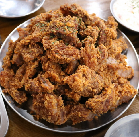 - 튀기기: 170도의 기름에서 한 번 튀긴 뒤, 1분간 건져두었다가 다시 180도 고온에서 한 번 더 튀겨냅니다. 부산 돼지갈비 후라이드, 닭강정처럼 바삭한 식감을 위한 비결입니다.