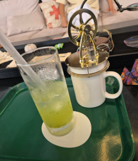 - 메인: 버터플라이피 꽃잎 (또는 자색고구마 분말) 5g, 뜨거운 물 200ml, 레몬즙 1T, 탄산수 또는 사이다, 얼음