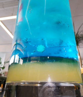 - 색 변화 연출 (산성 실험): 미리 준비한 푸른색 버터플라이피 우린 물을 잔 위로 천천히 부어 그라데이션을 만듭니다.