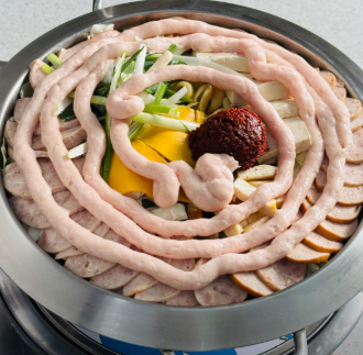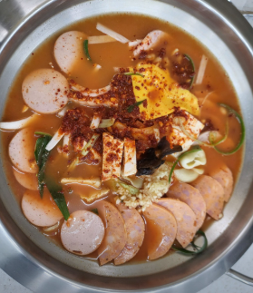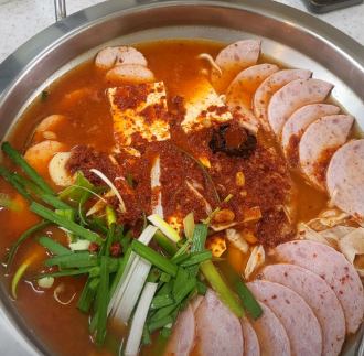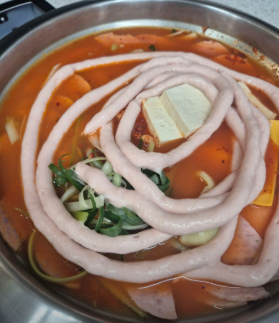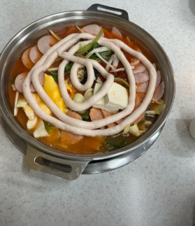 - 메인: 스팸, 소시지, 베이컨 등 다양한 햄 (고급 생햄 사용 추천), 김치 1/4 포기, 두부 1/4모, 양파 1/2개, 대파 1대, 떡, 라면 사리, 슬라이스 치즈 1장