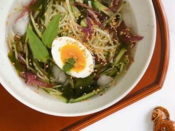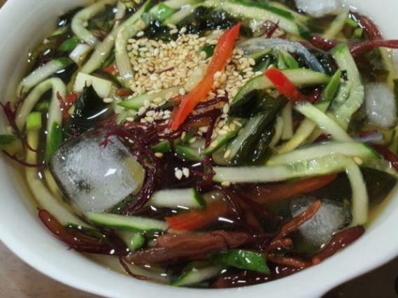 - 마무리: 해초와 오이, 슬라이스 전복 2마리 분량을 그릇에 담고 시원한 냉국 육수를 부어 완성합니다.