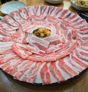 장수식당의 김치삼겹살은 평범한 삼겹살이 아닙니다. 이 집의 김치삼겹살이 특별한 이유는 바로 '솥뚜껑'과 '잘 익은 김치'에 있습니다. 뜨겁게 달궈진 솥뚜껑은 삼겹살을 겉은 바삭하고 속은 육즙 가득하게 구워내며, 여기서 흘러나온 돼지기름은 김치삼겹살의 맛을 한층 더 끌어올리는 천연 조미료 역할을 합니다.
