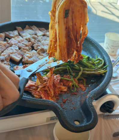 • 5. 고기가 다 익으면 불을 끄고 준비한 미나리를 올려 잔열로 살짝만 숨을 죽입니다.