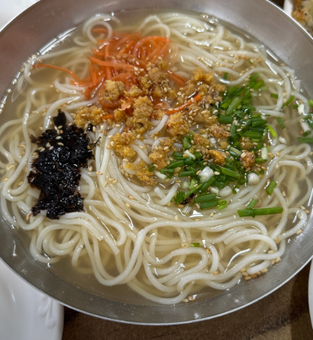 - 재료: 소면 1인분, 신선한 성게알 50g, 오이 약간, 김가루, 통깨.