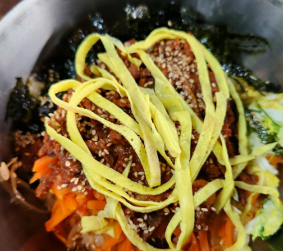 - 마지막으로 양념해 둔 육회를 중앙에 넉넉히 올리고, 계란 노른자를 얹어 마무리합니다. 기호에 따라 참기름을 추가해 맛있게 비벼 먹습니다.