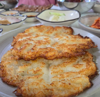 - **굽기:** 팬에 식용유를 넉넉히 두르고 반죽을 얇게 펴서 앞뒤로 노릇하고 바삭하게 구워줍니다. 인제 감자전처럼 바삭하고 쫀득한 감자전이 완성됩니다. 인제 막국수와 함께 곁들여도 좋습니다.