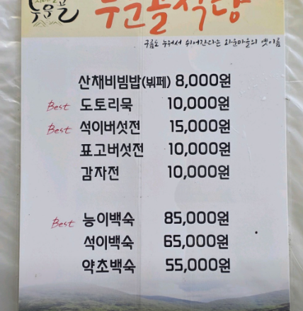 누운골식당의 메뉴는 지리산에서 얻은 귀한 식재료를 중심으로 구성되어 있습니다. 단연 돋보이는 것은 석이버섯을 활용한 석이백숙입니다. 석이버섯의 귀함 때문에 가격대가 있지만, 그만큼의 가치를 하는 진한 보양식입니다. 석이백숙 외에도 능이버섯이 들어간 능이백숙, 다양한 약초를 넣은 약초백숙 등 몸에 좋은 보양 메뉴들이 준비되어 있습니다. 또한 간단한 별미로 감자전도 판매하고 있어 함께 곁들이기 좋습니다. 모든 메뉴에서 지리산의 순수하고 깨끗한 맛이 느껴지며, 특히 석이버섯의 독특하고 쫄깃한 식감은 다른 버섯에서는 느낄 수 없는 특별한 경험을 선사합니다. 석이버섯이 들어간 석이백숙은 이 집의 자부심입니다.