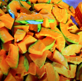 - 육수 재료 준비: 시판 백숙용 한약재 1봉지, 황기, 대추, 통마늘, 그리고 동과 대신 무 반 개 또는 밤호박 약간을 큼직하게 썰어 준비합니다.