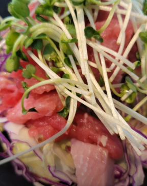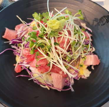 - 6. 접시에 어린잎 채소를 깔고 참치를 올린 뒤 미리 섞어둔 소스를 뿌려 마무리합니다.