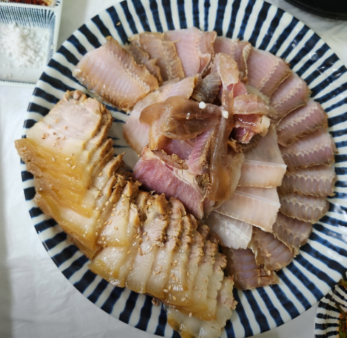 - 조합하기: 접시에 수육, 홍어, 김치를 나란히 담아냅니다.