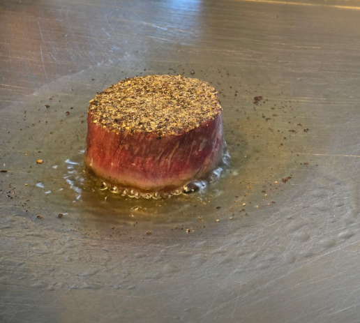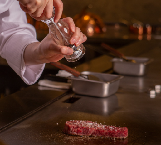 - 시어링: 무쇠 팬을 연기가 날 정도로 뜨겁게 달군 후, 준비된 한우를 올려 센 불에서 각 면을 1분씩 시어링 합니다.