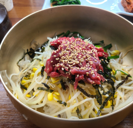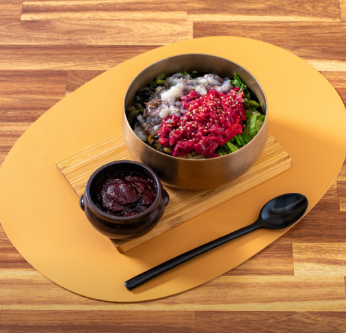 - 마무리: 육회 위에 계란 노른자 하나를 올리고, 비빔장을 따로 내어줍니다. 취향에 따라 참기름을 더 둘러 한우육회비빔밥을 완성합니다.