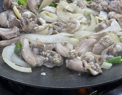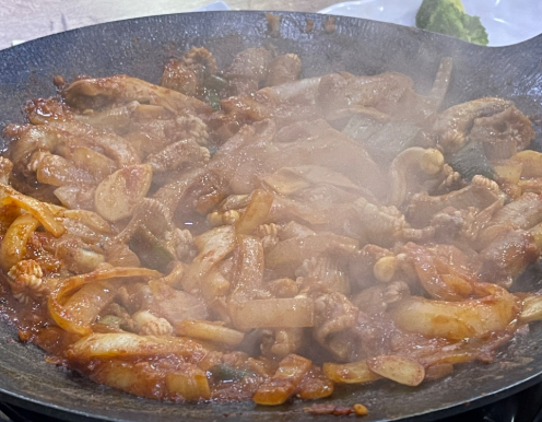 - 준비한 채소를 먼저 넣고 볶다가, 낙지를 넣고 바로 양념장 3/4를 넣어 센 불에서 빠르게 볶습니다. 낙지 한 상의 비결은 빠른 조리입니다.
