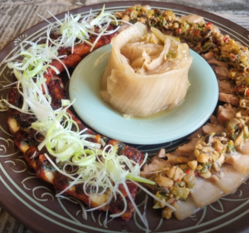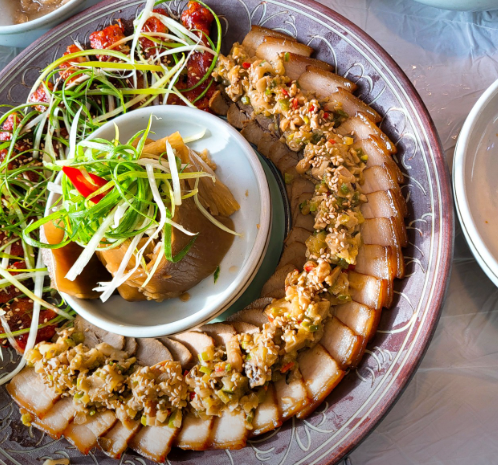 순창 특산물과 장맛을 결합하여 만든 이 순창 삼합은 돼지고기와 함께 각종 나물, 장아찌, 또는 묵은지 등을 곁들여 먹는 형태로 제공되며, 순창 고추장의 깊은 양념 맛이 조화롭게 어우러집니다. 푸짐하게 차려지는 반찬 가짓수와 함께 건강한 순창의 맛을 경험할 수 있습니다.